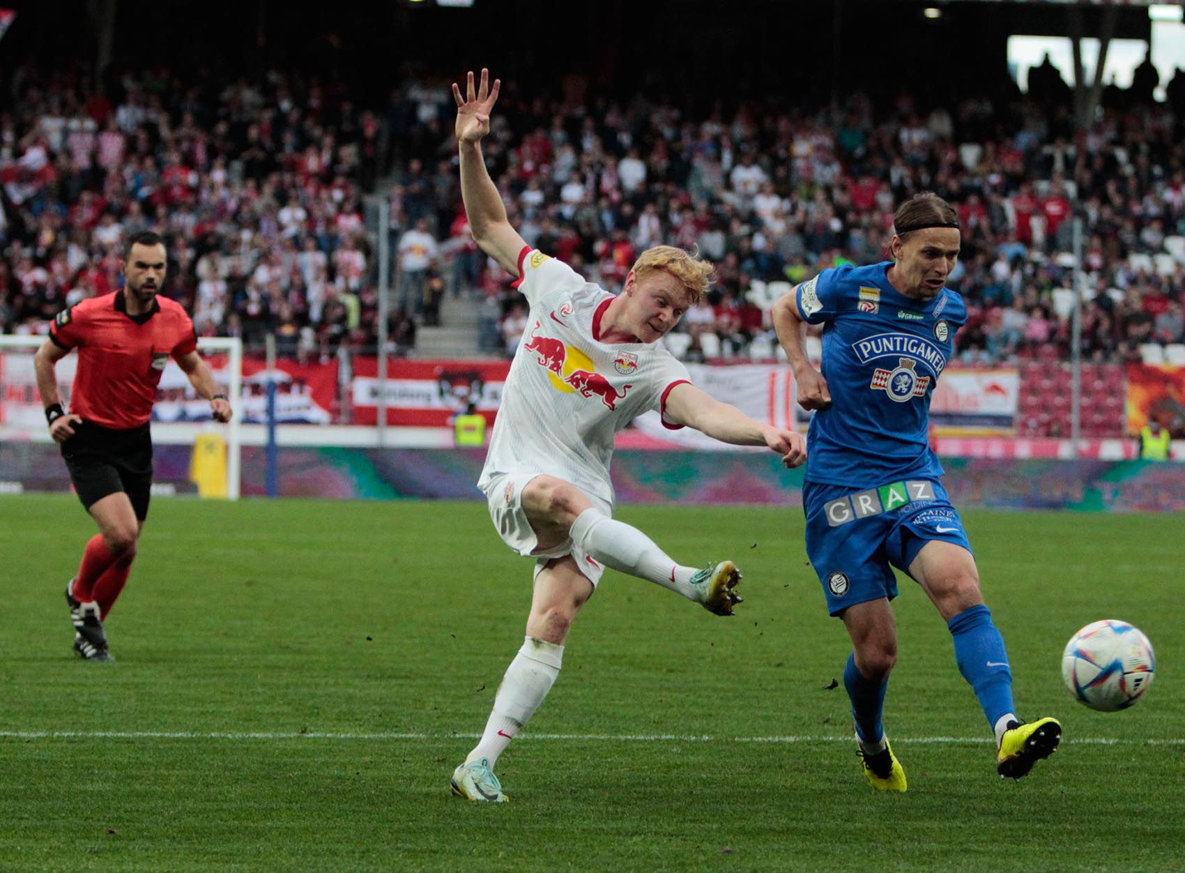 Vor 16.094 Zuschauern - damit vor ausverkauftem Haus, nachdem die Oberränge nicht geöffnte waren – war es Salzburg-Verteidiger Pavlovic der mit seiner Offensivaktion in der 37. Spielminute das Tor von Jörg Siebenhandl knapp verfehlte.